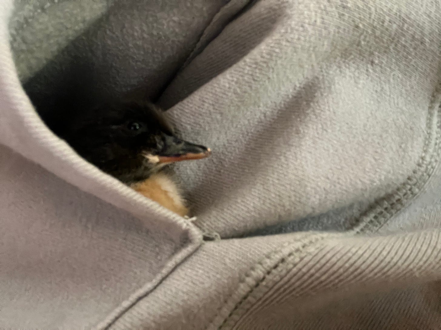 I’m writing this with a not-yet-twenty-four-hours-old duckling in the pocket of my hoodie. He? She? It only stops maniacally peeping when I stick it in my fuzzy pocket where its weighty warmth surrounds the little thing. It’s about as close as I can get to feathers. I’m amazed that this tiny fella’ is still breathing. I found a skunk stealing an egg this morning. Unfortunately, it was a brewing egg. The skunk took a bite and ran when I came up the path. How this little one is still alive, I do not know, but I’m going with it. It’s been a few weeks of births and deaths around here and I’m just about done with the death part of the equation. We’ll see what this black-beaked lightweight is made of.